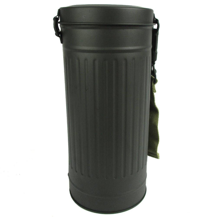 This is a replica of the M38 gas mask canister issued to most German combat troops in WWII. Essential for reenactors, this canister features a steel construction, sturdy canvas carry straps and an interior spare lens compartment, just like the original.