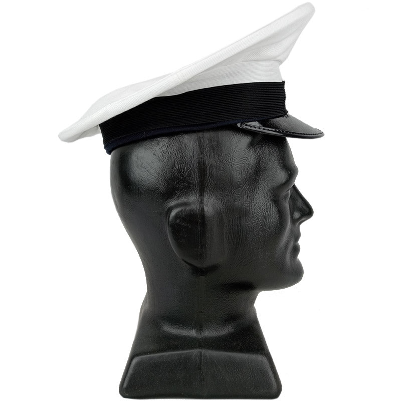 These peaked caps are what Italian Navy officers currently wear with their dress uniforms. A black band runs around the head with a rigid vinyl stiffener in the forehead for adding shape & badges. On the inside is a leather sweatband that you can bend into shape somewhat and maintain a good grip on your head. Complete with stiff vinyl visor, all quality made in Italy.