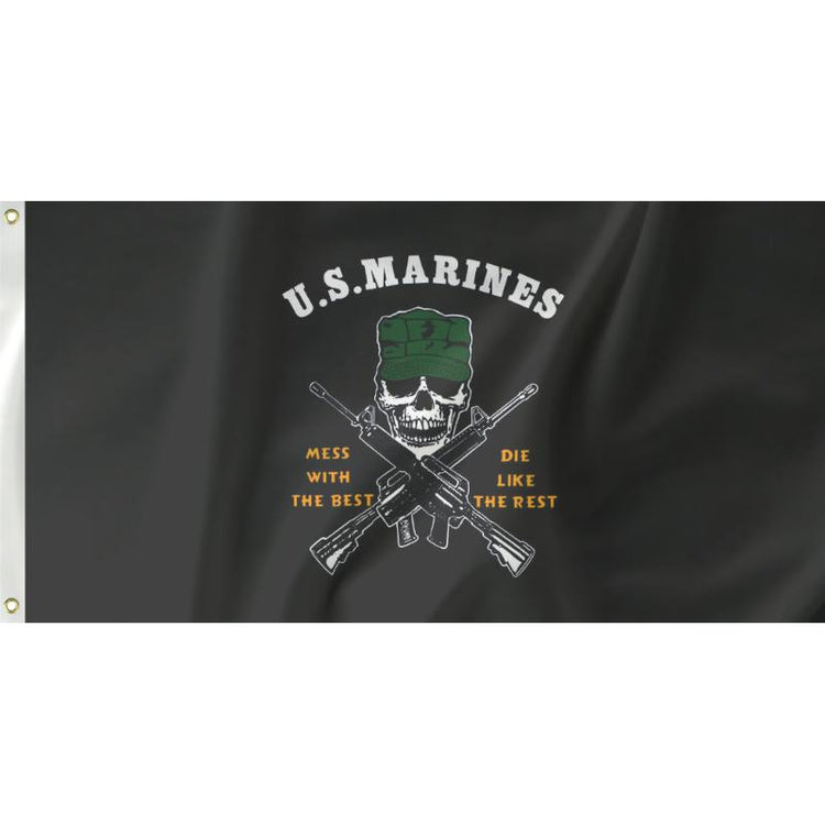 Show your support for the U.S. Marines with this unique flag. Completed with metal eyelets on the left side to attach to flag poles . Measuring 155cm x 90cm it will fit nicely in your house or man-cave. Show your dedication and pick up a flag today!