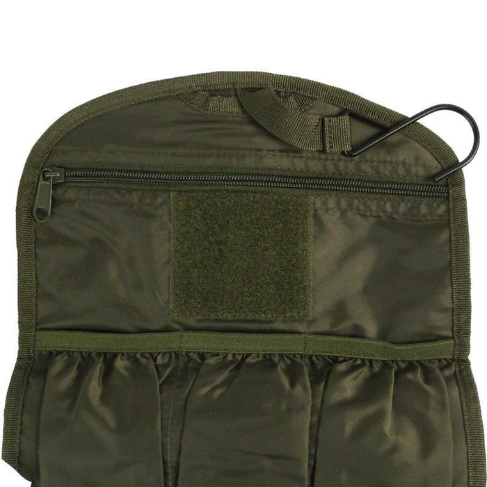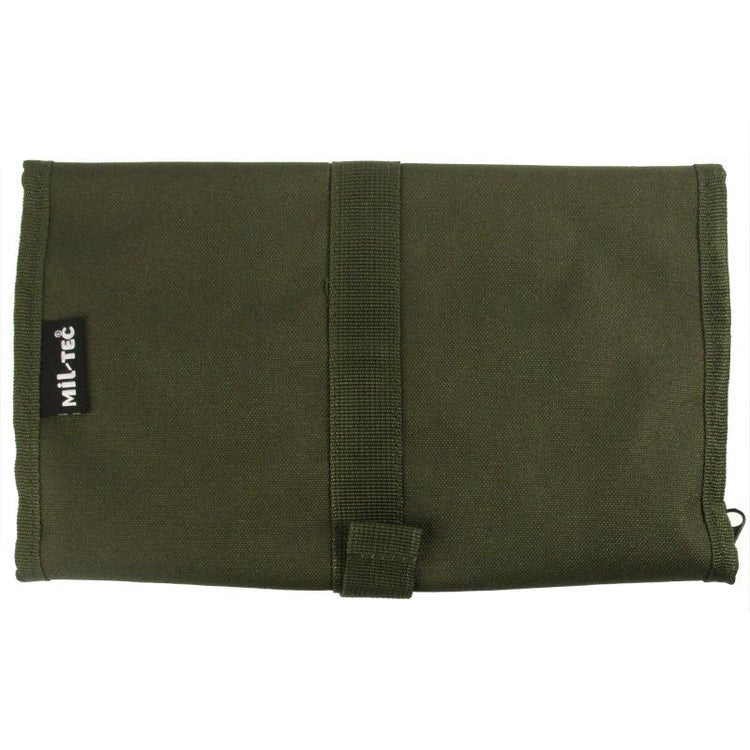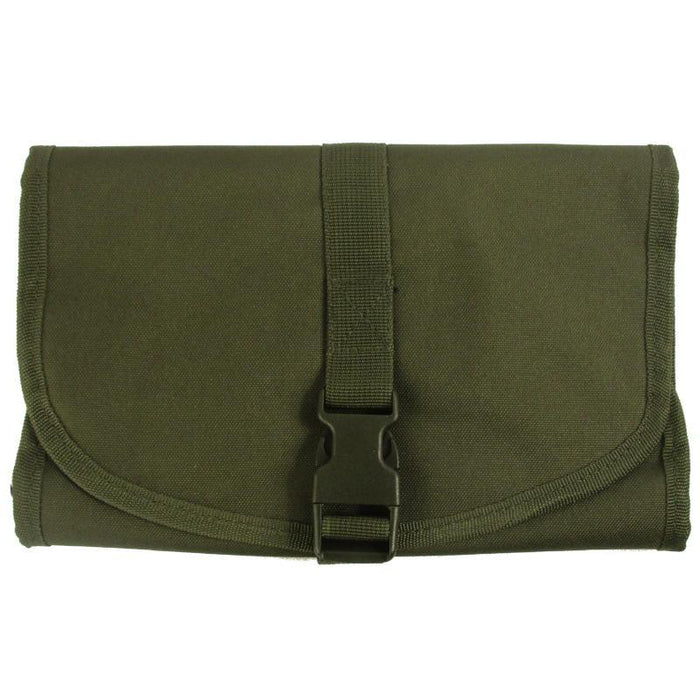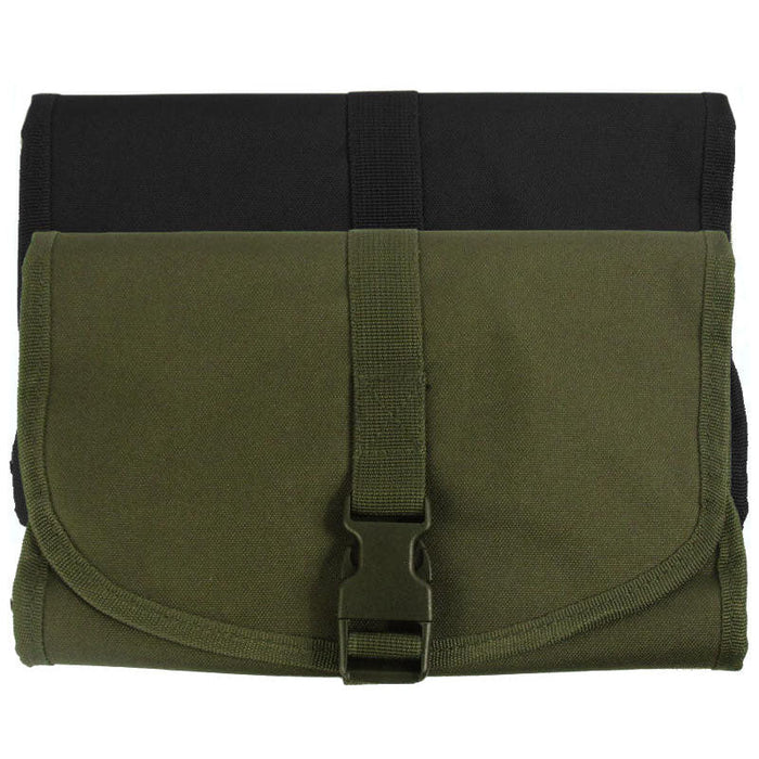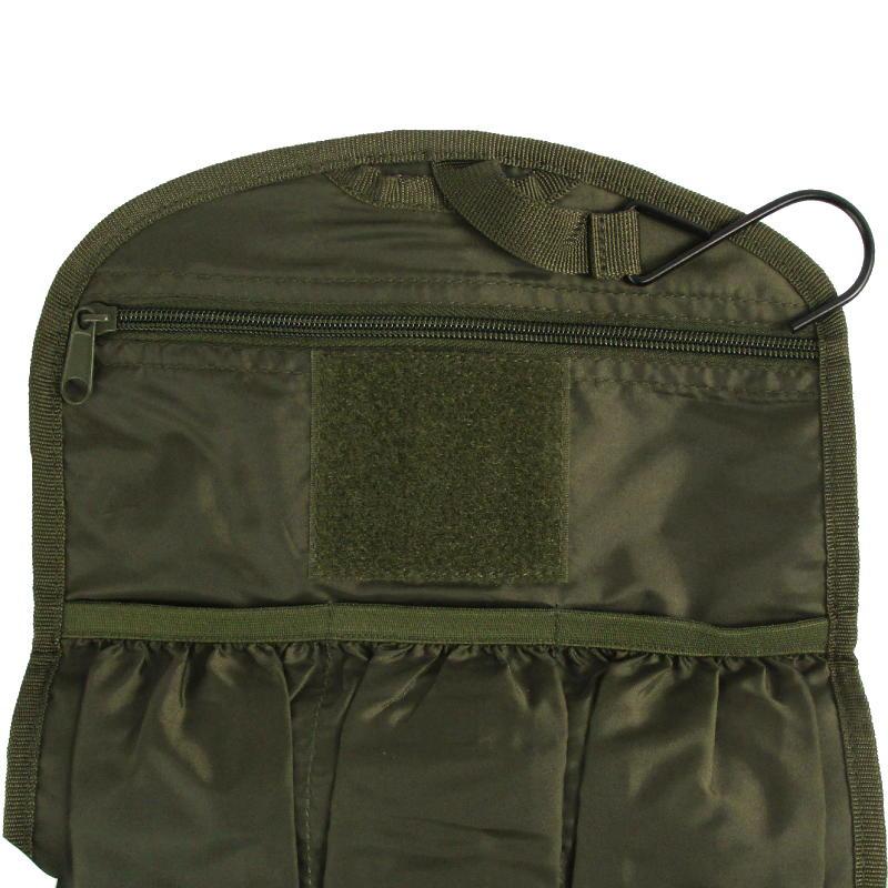 This bag folds into a compact and lightweight pouch to store and carry your toiletries. The military inspired design includes a hook to hang up the bag and an acrylic shaving mirror, fastened in with hook & loop. Behind the mirror is a large zipped pocket, below that are three pouches and a mesh pocket. All of this folds down into a third of the size and fastens with a quick-release buckle. Perfect for travel, camping and hiking.