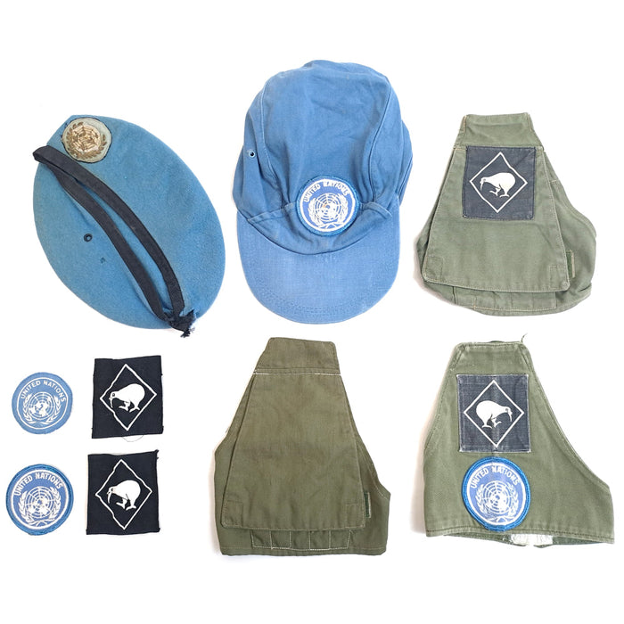 UN beret with embrioded bullion wire insignia. Has been cut down the back, likely to fit the original owner better if no other size was available. Liner has been removed. UN cap with patch. Left and right brassards with Kiwi insignia, left with pen pockets. Single brassard without insignia and pen pockets. Two left arm Kiwi insignia and two UN sleeve patches.