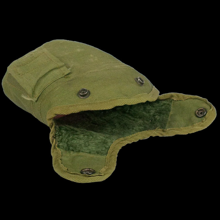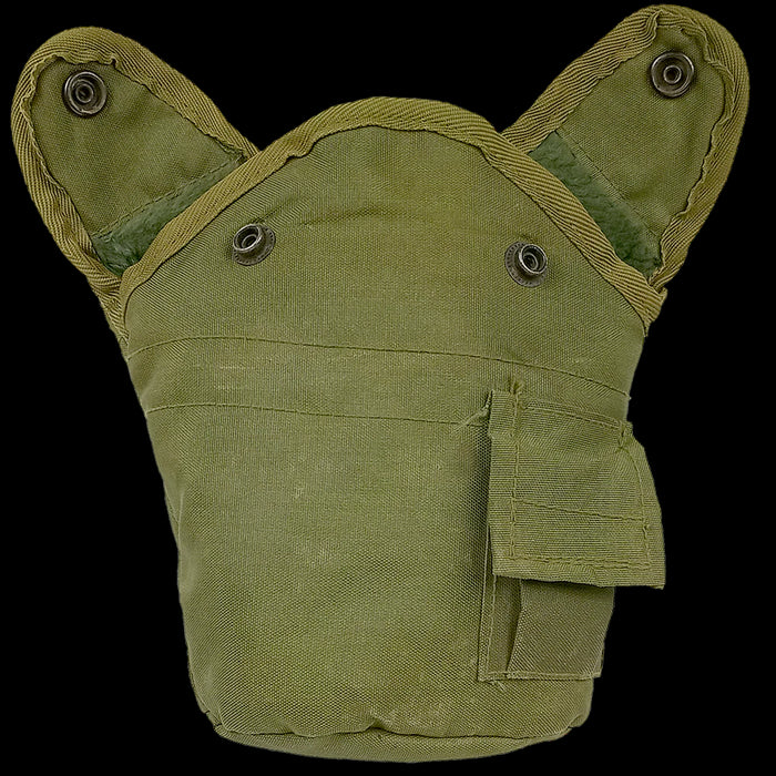 Covers have 2 snap domes, a fuzzy interior lining for insulation and a drainage eyelet to the bottom. The attachment strapping to the back will take ALICE clips and the little pocket to the outer is handy to store water purification tablets. All used hydration components are display/prop/collectable only and not for consumption use.