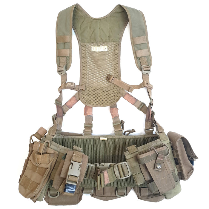 New Zealand Army coyote MOLLE padded belt with harness. This is made up from a variety of different manufacturers. Belt pad and yoke are Platatac, pouches are a mix of NZDF issue, Twin Needle, Platatac, and SORD. Likely used for range use considering the limited magazine capacity.