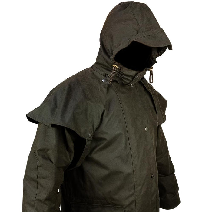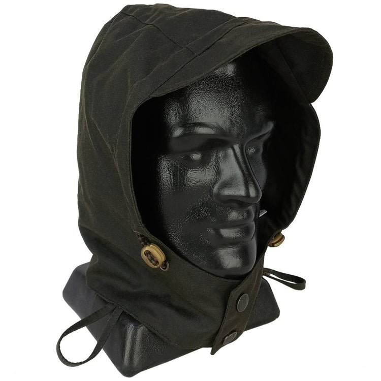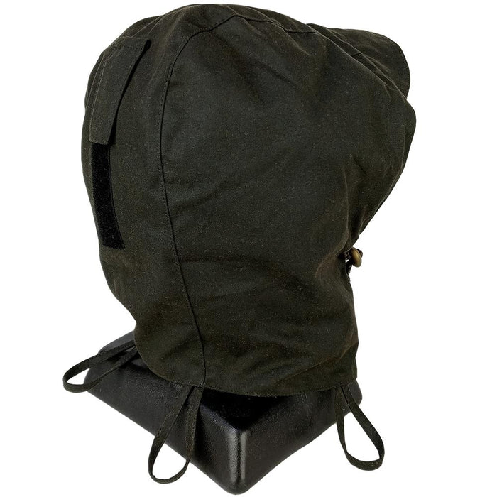 If you own one of our Outback Low Riding Oilskin Coats, you got to add one of these bad boys. When the rain really packs in its no good keeping just your body dry - these hoods will keep the rain at off your face while herding cattle! Four simple loops go around the snap domes on the rear of the coat to attach easily. A further two snap domes on the hood itself join to form a collar that comes up to the chin. A peaked bill provides good cover and can be synched in further with dual draw cords should you need it. Made with oilskin treated cotton canvas, these are both hardy and will keep you dry for years to come.