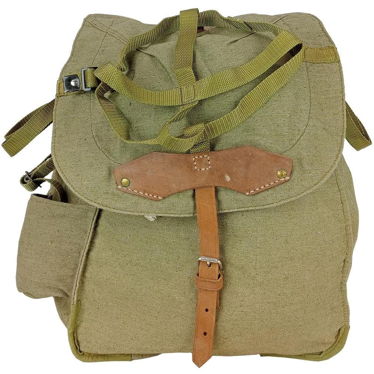 From Romania with love! This rucksack is as simple and rugged as they come. Manufactured from the 1970's-1980's these are based on a old German way of thinking-the back straps hook onto the back of the rucksack whilst the front straps would be intended to hook into a leather webbing belt. This is a later version that has added nylon straps - the front ones to store a helmet, the side ones to store a tarp or other clothing/gear.