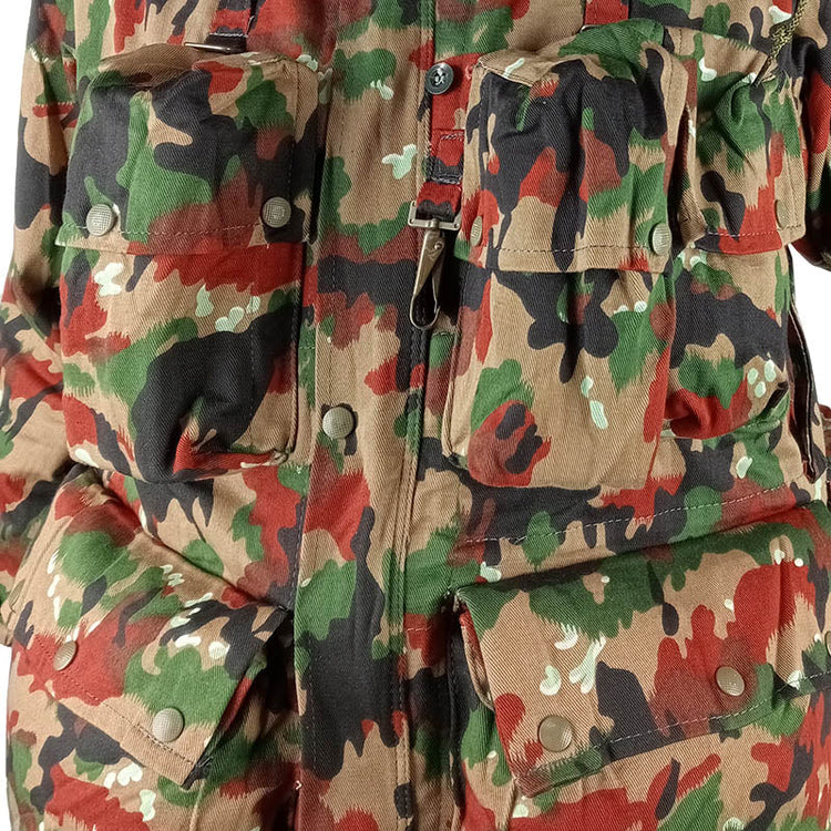 Packed with pockets and pouches to minimize the need of cumbersome packs and bags. Mags and frag pouches sit on the chest, while larger pockets are placed around the waist area, perfect for gear and equipment. The M70 is loaded with handy features that made soldiers lives easier. A metal clip placed on the chest was used to carry helmets when not in use. Interior pockets contained weapon cleaning kits, saving storage space. Constructed from a heavy-weight cotton fabric, we estimate it to be around 300gsm. If you're a paintballer/airsofter, hunter or the like, you'll love this top quality jacket.