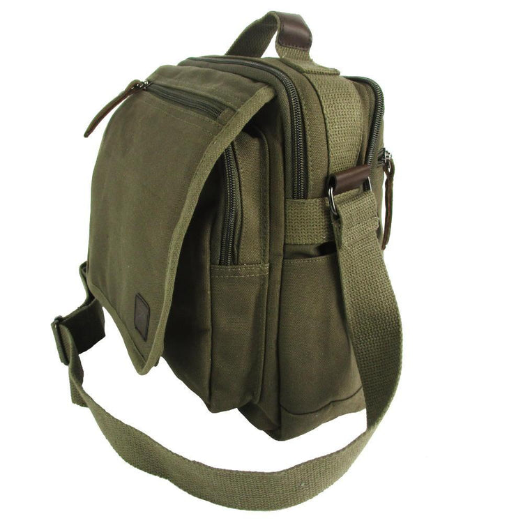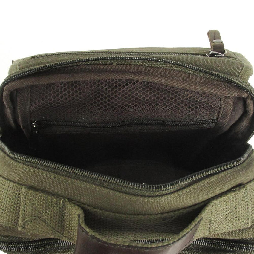 Stay organised while you're on the go with this shoulder bag, perfect for work and everyday use. A canvas construction with leather tabs and metal zips gives this bag a vintage military appearance. Sling it over your shoulder or carry it by the top handle to conveniently transport your days worth of goods.