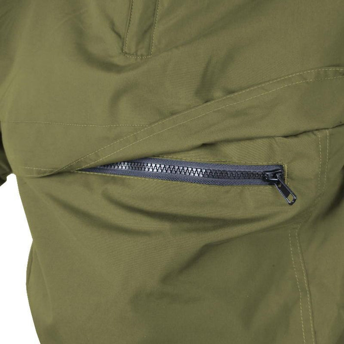 Made from 100% polyester microfiber these are lightweight and provide a small bit of water resistance against light showers but not heavy rainfall. The fabric is soft to the touch unlike a softshell and has a comfy fleece lining. With a short chest height zipper there is enough room to get your head through comfortably and when the hood is in use, it can zip up to your nose. The hood has an adjustable draw cord so you can 'turtle up' when the wind gets really strong. You can also adjust the waistline with a draw cord as well to provide more insulation. One of the handiest features of this anorak is its large chest pocket. It is protected by a storm flap and secured with a zipper. You can easily fit your phone, earphones, diary or maps safely in here. There are two zipper waist pockets along with a zipper pocket on the left arm. This left arm pocket also has a hook & loop area on the top for any ID or morale patches.
