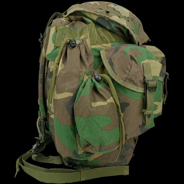 The main differences between this pack and a USGI one is the exterior pockets are not pass through and addition of attached, cylindrical side pouches, instead of webbing. Pretty neat! Expect some signs of service - scuffs, faded camo, corrosion to metal fixings and a bit of character - but that’s part of the charm. These are built tough, meant for rough use, and have seen action in some serious terrain.