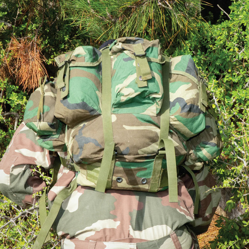 Constructed from heavy-duty nylon Cordura canvas in the M81 Woodland camouflage pattern, this large field pack features a top-loading main compartment with a cinch cord, plus three external pockets with dome closures. These do not come with a frame or lumbar belt but are compatible with the US ALICE frame, which would increase the load-bearing ability.