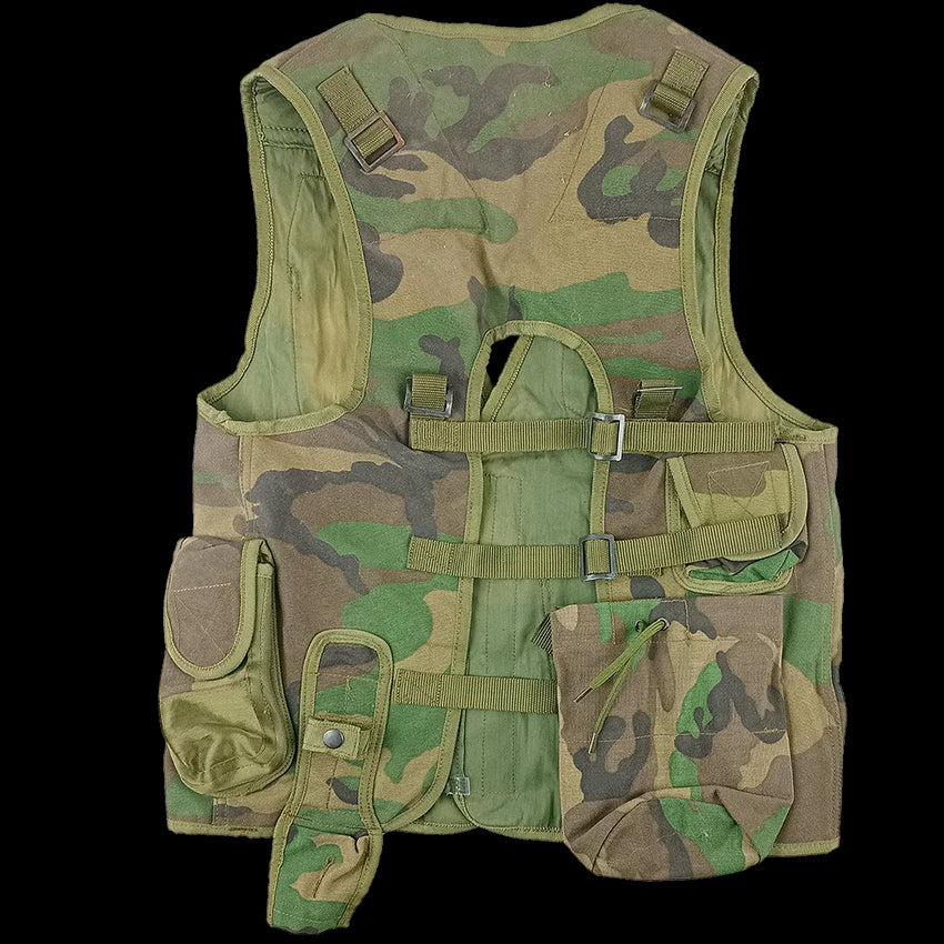 The front of the vest features multiple integrated pouches designed for AK/HK or similar rifle magazines, with additional utility compartments for gear, tools, or grenades. In a appealing M81 woodland clone camouflage, we might add.