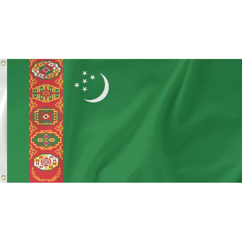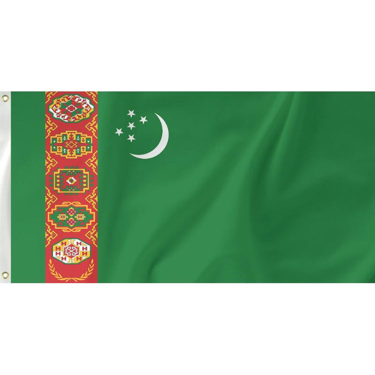 Turkmenistan adopted their flag in 1992 after the fall of the Soviet Union. The flag features a representation of the country's famous carpet industry on top of a green background. The crescent represents Islam and the five stars represent the five regions of the country.
