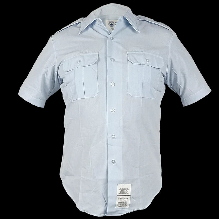 This US Air Force Blue dress shirt features a short-sleeve, button-up design tailored for more formal military occasions, perhaps in warmer weather. Crafted to meet uniform standards, it offers a sharp, professional appearance while ensuring comfort and durability throughout extended wear.