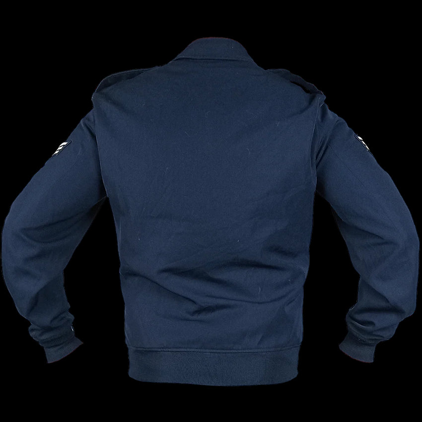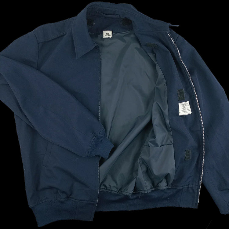 These jackets have ribbed cuffs and bottom hem, much in bomber jacket style but without the sheen and with a fold down collar. Some of these jackets have no embroidery or patches, some of them do.