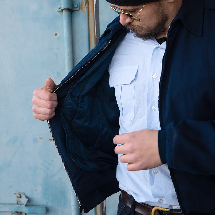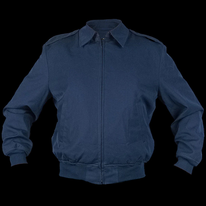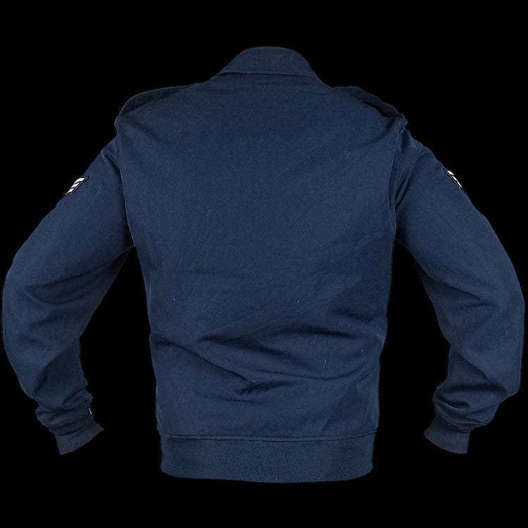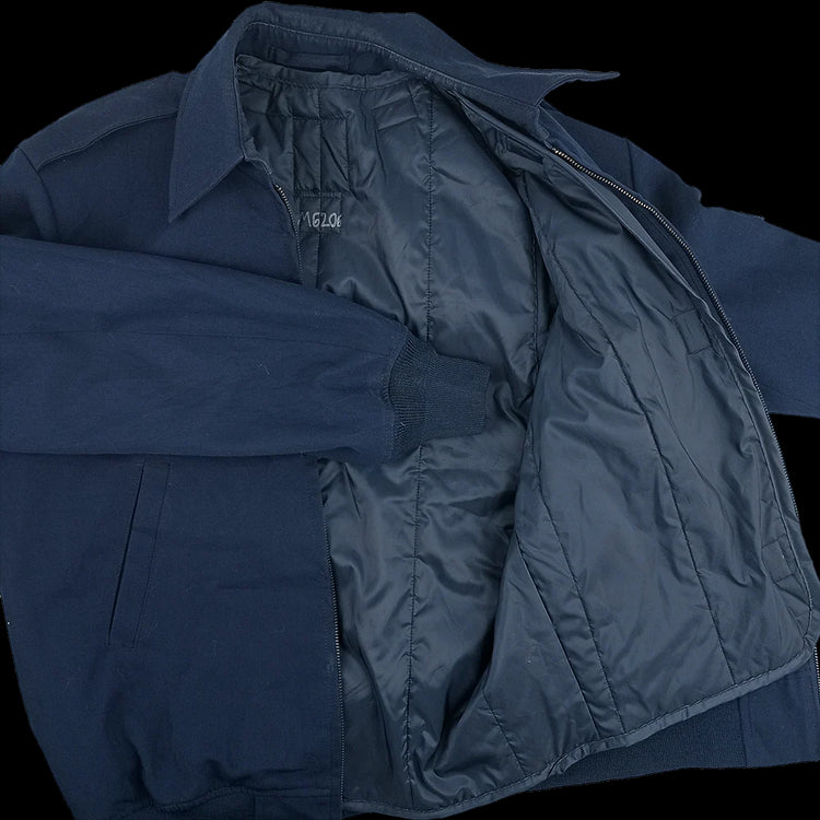 These ones have a sleeveless, vest-style, light polyester liner for those colder moments. The liner attaches with hook & loop and will keep your torso toasty. These jackets have ribbed cuffs and bottom hem, much in bomber jacket style but without the sheen and with a fold down collar. Some of these jackets have no embroidery or patches, some of them do.