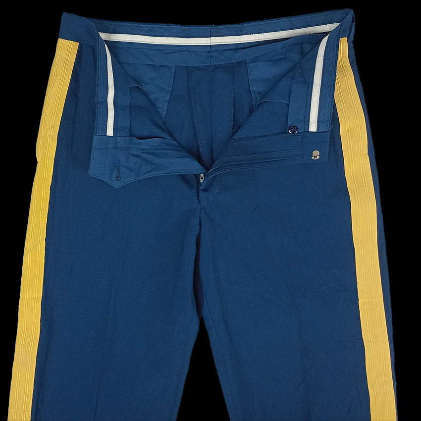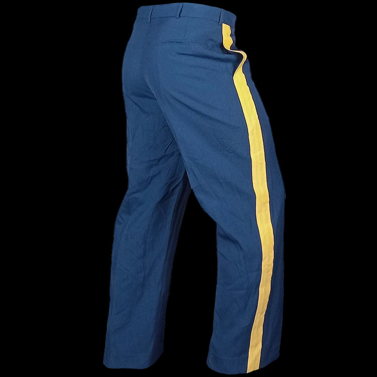 US Army service dress trousers for officers are navy blue with a distinct yellow stripe running down the outer seam. The trousers are made from a range of materials, typically a polyester to poly-wool blend, offering both durability and comfort. They feature a sharp, professional appearance, designed to be worn with the Army’s formal service dress uniform.