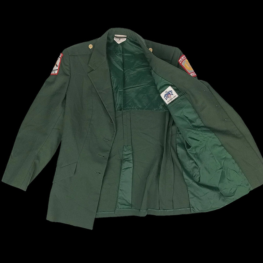Dating from various eras, these jackets typically feature a wool/polyester blend, with some possibly containing Dacron. Attached patches, when present, will differ from jacket to jacket. Designed with a structured military silhouette, they feature traditional elements like a notched collar and a streamlined fit. Ideal for a polished, formal look that balances comfort and durability.