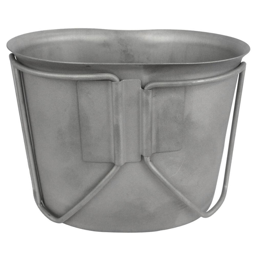 Here we have a US style canteen cup, the middle part of a canteen set. Complete the set with a canteen and pouch. This cup securely holds a canteen in place and makes transportation easier. The cup itself is used for cooking and eating out of. Foldable "butterfly" handles provide an easy grip while using.