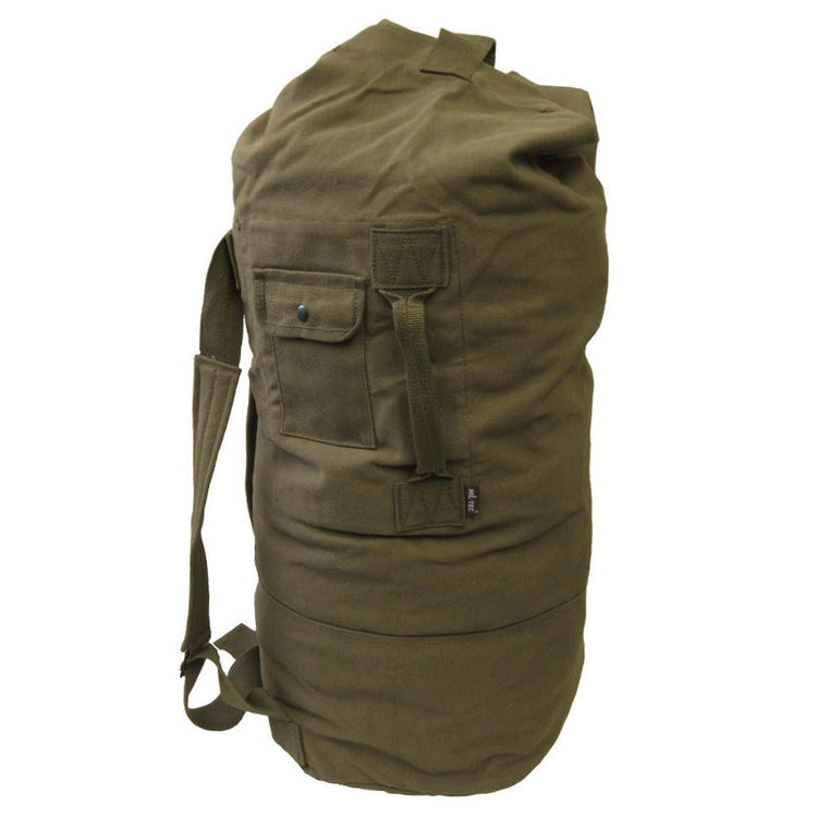 Heavy duty cotton canvas, has a nice sturdy feeling to it. Two large adjustable straps for carrying, accompanied by a sturdy carrying handle and front pocket. Instead of a drawstring closure, these fasten with a clasp that threads through eyelets.