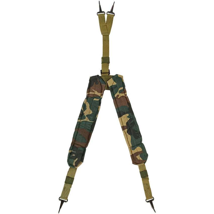 If you're an ALICE user and/or woodland fan, here's some interesting LC-2 Y suspenders! These are cheekily woodland camouflage on the underside (classic olive drab to the outer webbing) and interestingly were made in Korea - the woodland colouration has a deep emerald green. The shoulder pads are about 6.5cm across and have 4 snap closing clips to hook onto an ALICE belt. These are great for sharing some of a belts weight to the upper body and add some extra pizzazz.