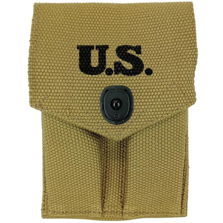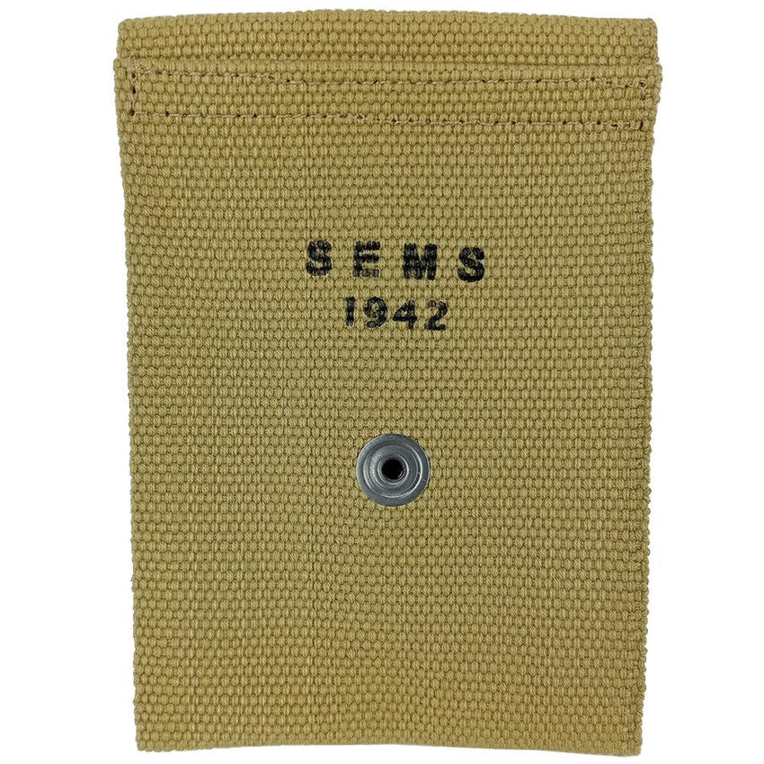 This pouch is a reproduction of what was standard issue with the M1911 issued throughout World War 2. Officers, heavy weapon teams and rear line soldiers primarily utilized a sidearm over frontline troops (although not exclusive). Able to carry two M1911 mags, you can access them quickly with a dual snap stud secured flap. The rear has a sleeve you can feed your service belt though and secure its position with a snap stud internally.