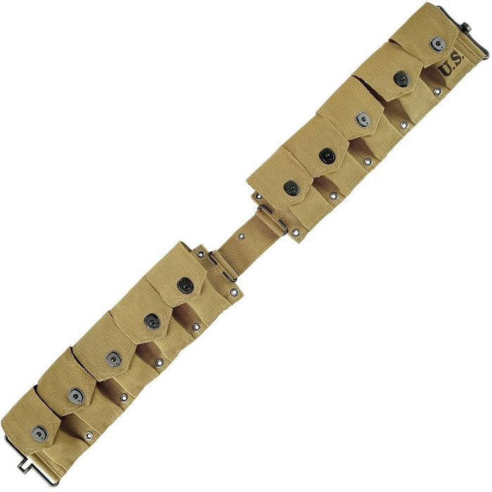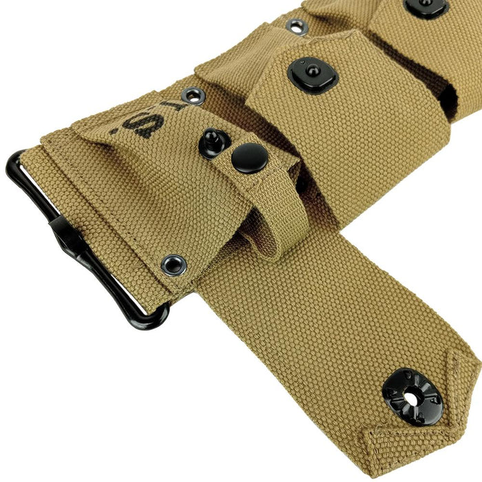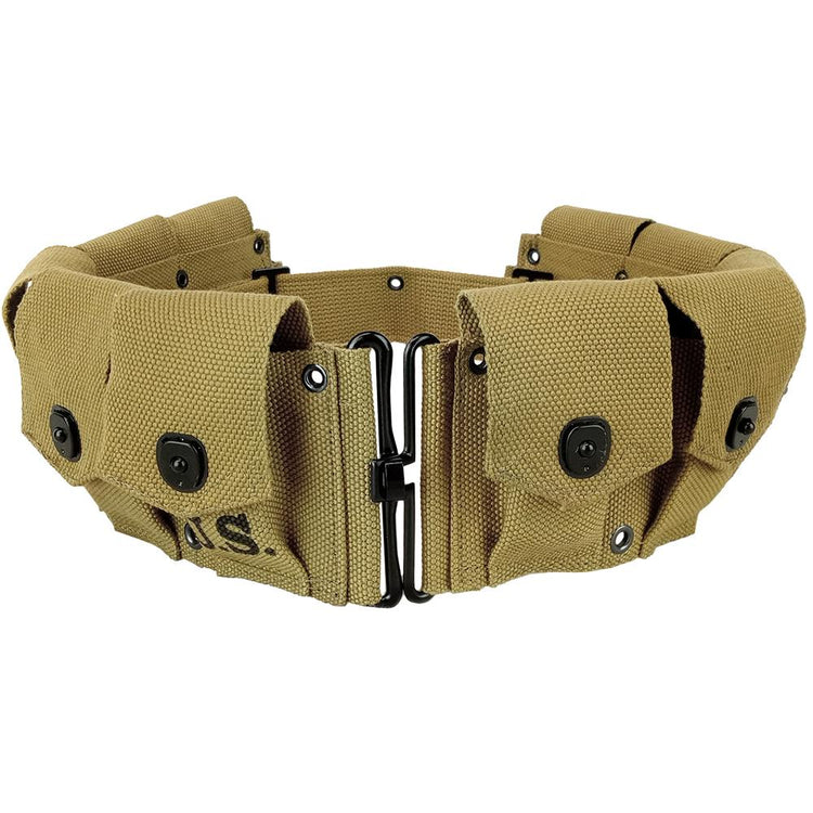 US soldiers marching into battle during WW2 by and large were wearing one of these cartridge belts. The predominant tool of choice initially being the M1903 while transitioning to its replacement, the M1 Garand. A soldier could hold 20 x 5 round M1903 stripper clips or 10 Garand enblocs in these pouches. Snap studs are used to secure the flap and open quickly on the fly with a bit of practice. Each belt is adjustable allowing a huge range of sizes so you most likely won't outgrow one of these in a hurry!