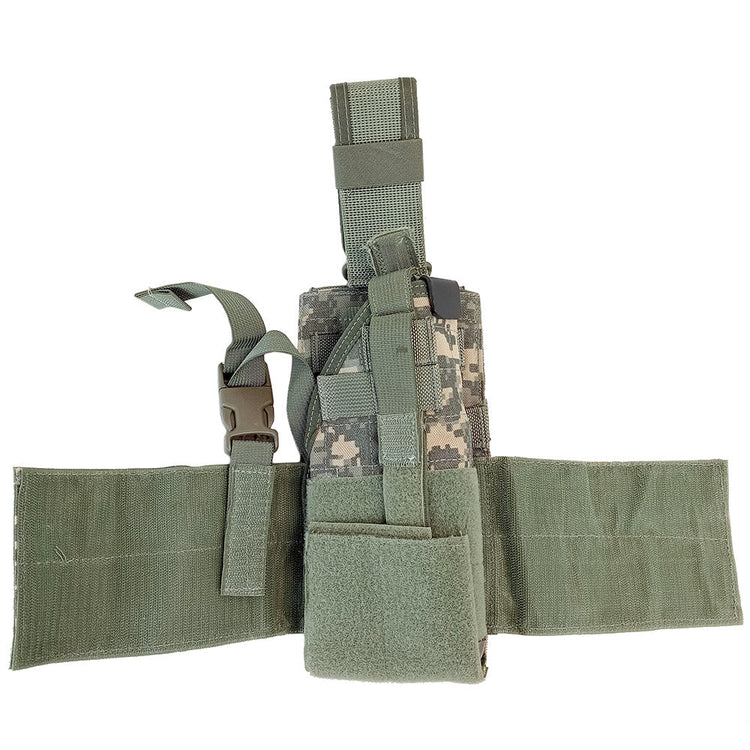 Constructed from a durable 1000 denier Cordura nylon with a versatile design. The holster can be custom fit for different pistols with the Velcro and strap adjustments. An adjustable thumb break system offers a quick-draw and re-holster of the pistol. Additional accessories can be attached to the webbing straps on the front. For a complete pistol carrying solution, pick up this genuine issue tactical holster from the US.