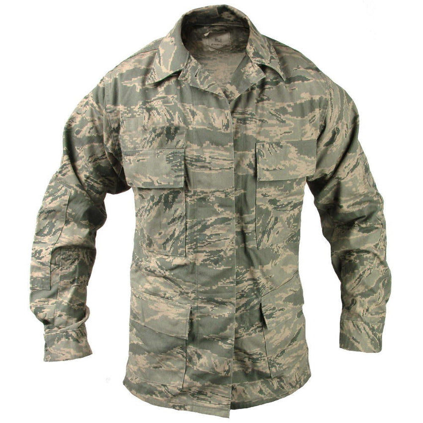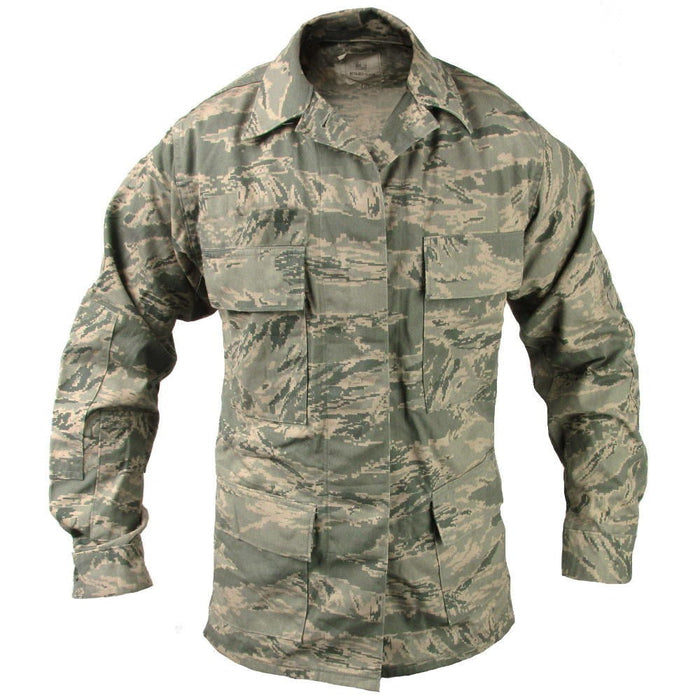 This utility coat features the same camouflage pattern as the Airman Battle Uniform (ABU) of the US Air Force - the digital tiger stripe pattern. Originally the coat began being issued in 2007 for the ground personnel.