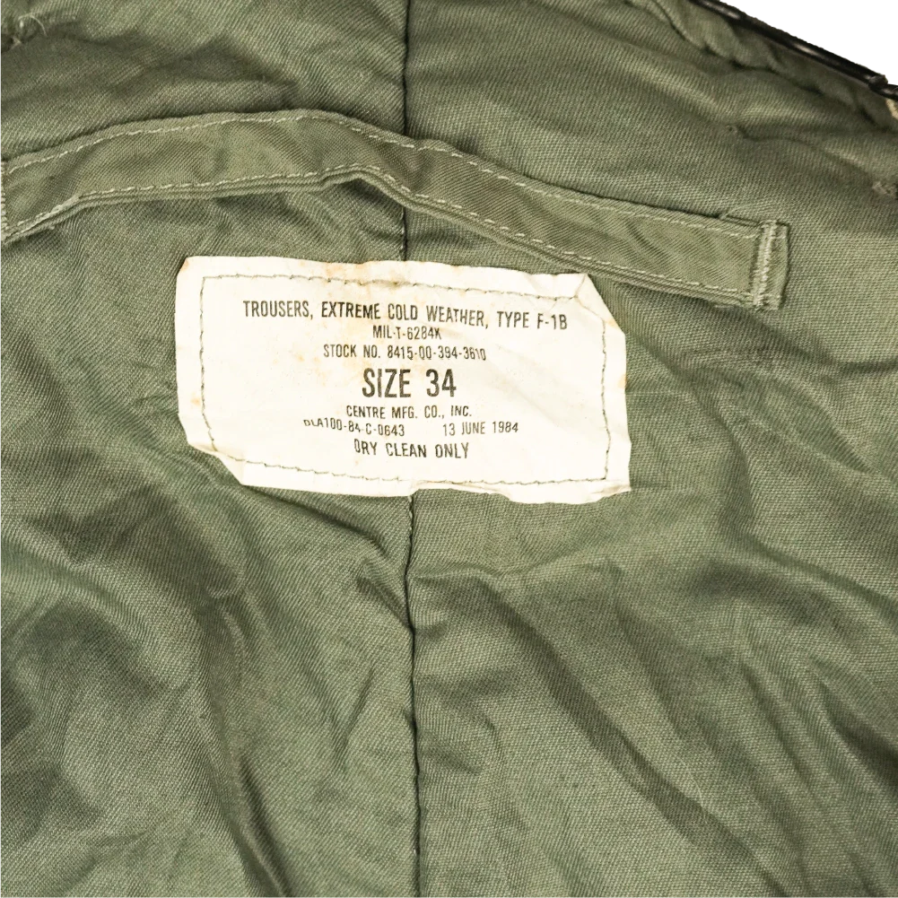 USGI F-1B Extreme Cold Weather Trousers. Military surplus insulated over-trousers designed for cold weather conditions.