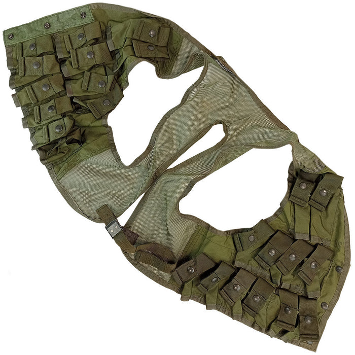 There are a few material differences between these and the late 1960s vests, but the main one is the top row chest pouches. This version they were extended in order to allow for specialist/non lethal rounds to be carried. The rest of the vest is covered in 20 normal 40mm grenade pouches - an impressive amount of thumping (and weight when full!). Each opens with a snap dome flap. The rear of the vest is mesh lined helping you stay cool as well as running slim allowing for packs to be carried over it easily. A rear strap can be pinched to extend or tighten the fit and the front buttons up with snap domes.