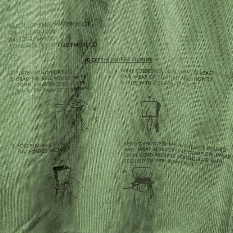 The design is simple - plain nylon bag with a rubberized internal lining that keeps water at bay. All the seams have been seal taped thoroughly to make sure there are no small leaks - though as these are surplus, we can't guarantee every seal is still watertight.