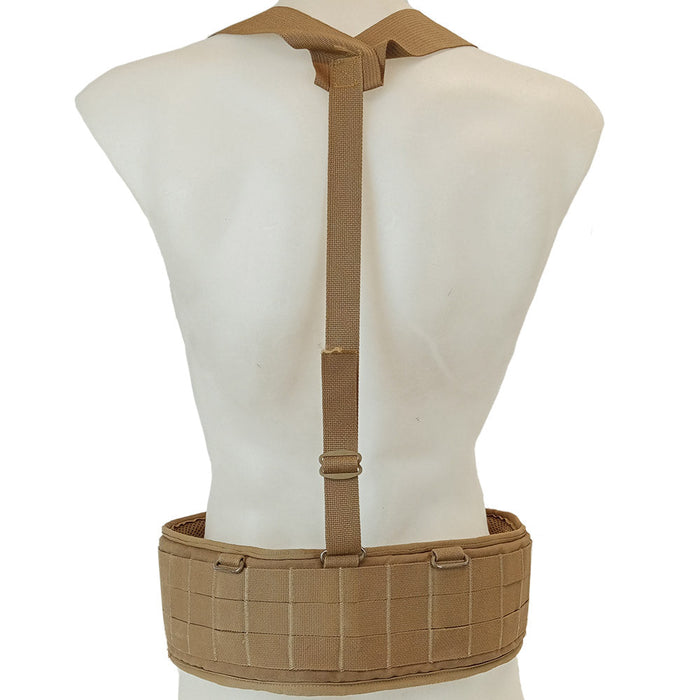 Share the load with this US load bearing belt. Featuring a MOLLE (Modular Lightweight Load-carrying Equipment) compatible, PALS (Pouch Attachment Ladder System) exterior belt and a semi rigid backing so your gear doesn't slog around too much. Fed inside this is the simple inner adjustable strapping belt (non-removable), with durable plastic clip closure and handy hook & loop tabs to keep excess belt length tangle free and tidy. The belt can further distribute weight to the shoulders with a humble, adjustable, Y back suspender and has the option to change to X/H back suspenders via extra attached rings. Let's not overlook the coyote brown colourway ...classic cool.