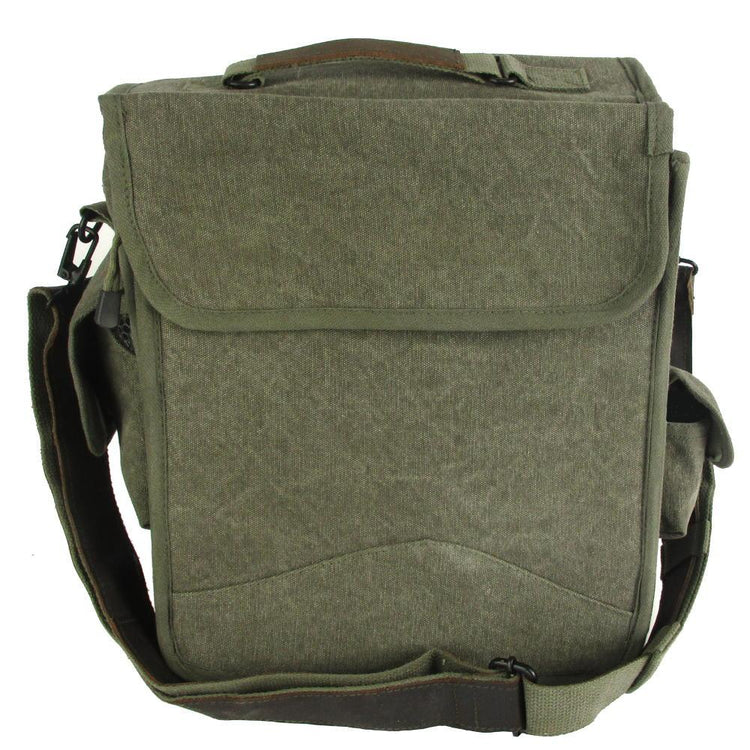 Rothco's M-51 engineer's shoulder bag combines a vintage military look and feel with features for a busy modern life. Constructed from a rugged cotton canvas with leather accents and brass hardware. Sling it over your shoulder or carry it by the top handle on your way to work, school or while traveling.