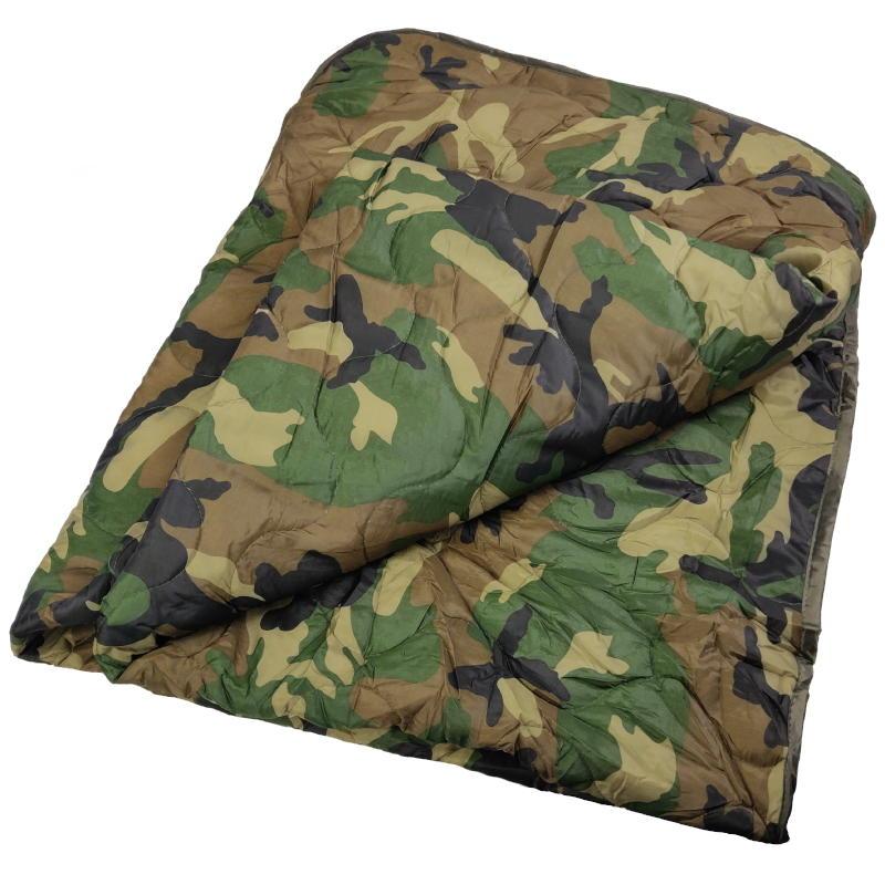 A poncho liner or 'woobie' is a much loved piece of kit. Poncho liners are water resistant and warm quilted blankets that can be tied into a poncho or used on their own. These woodland camo woobies are made from polyester with a synthetic filling.