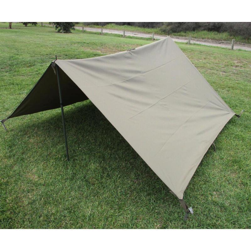 Bashas or hoochies are easy to setup waterproof shelters, designed for outdoor sleeping. This large basha can comfortably fit 2-3 sleeping bags and is finished in a khaki/green colour. Perfect for quick, easy outdoor sleeping and light to moderate rain protection. The khaki/green colour is an original military look and suits almost every setting.