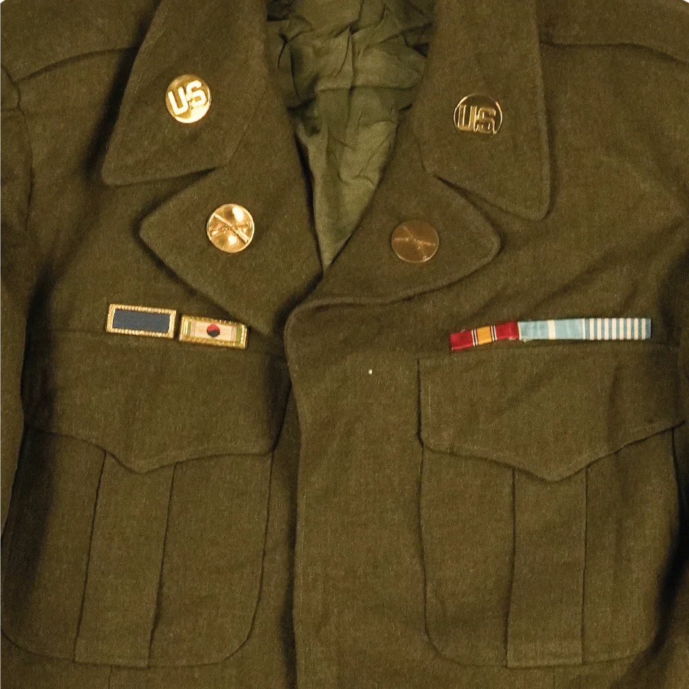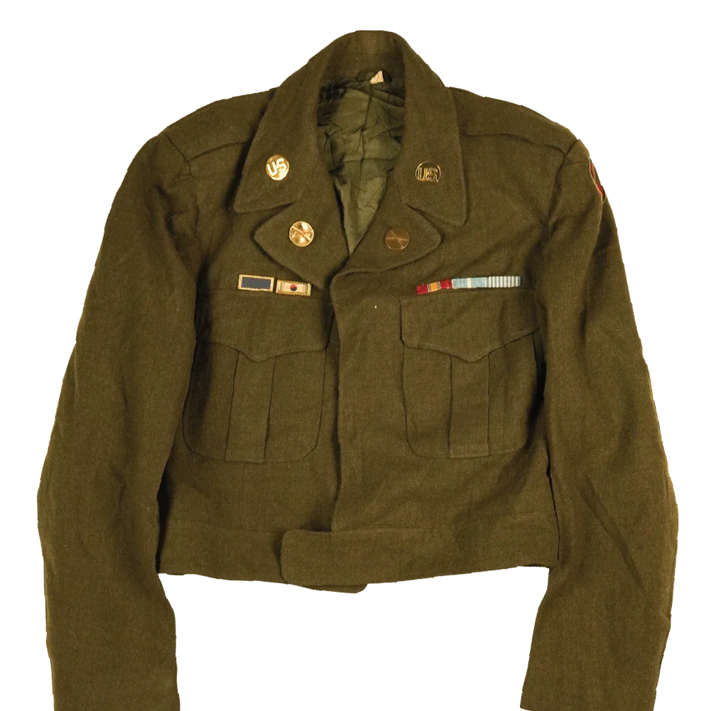 US M-1944 “Ike” jacket associated with the 24th Infantry Division. This is a short-waist military jacket in the WWII-era Ike jacket pattern.