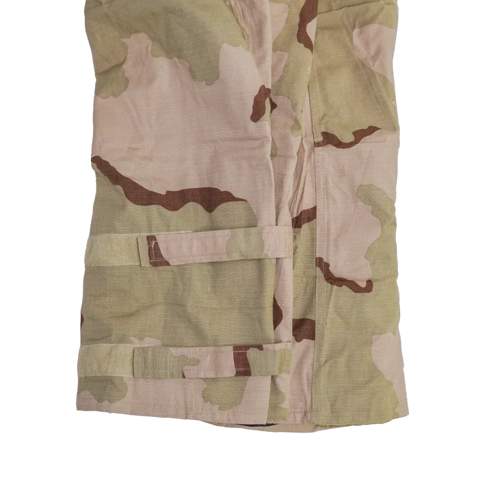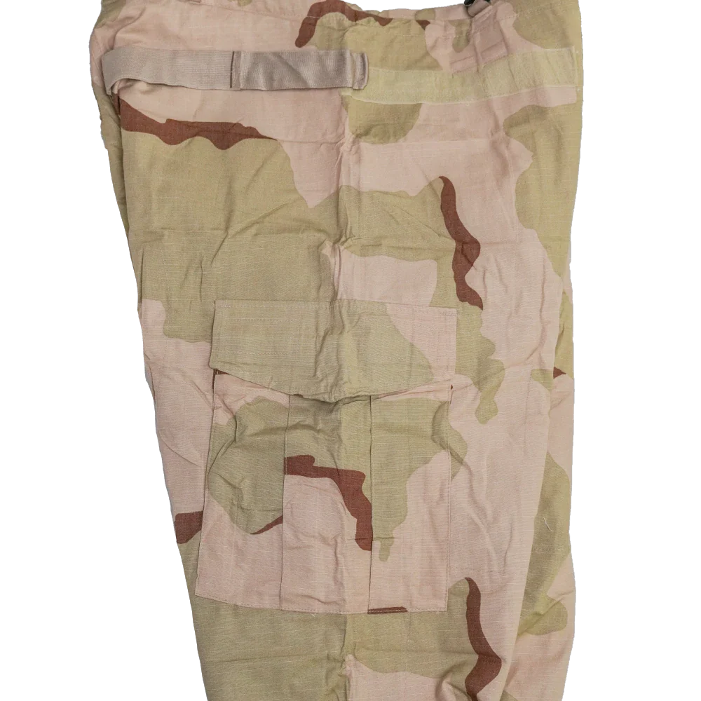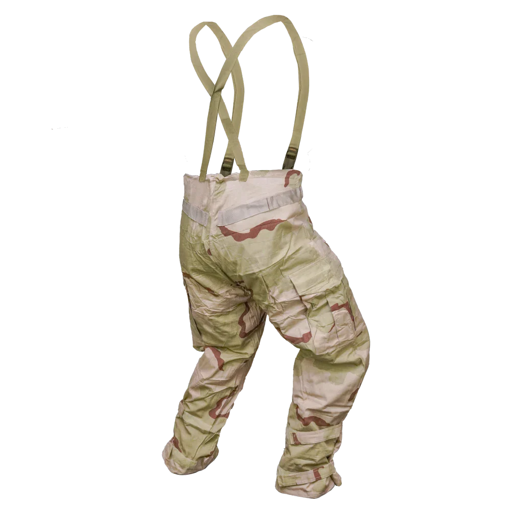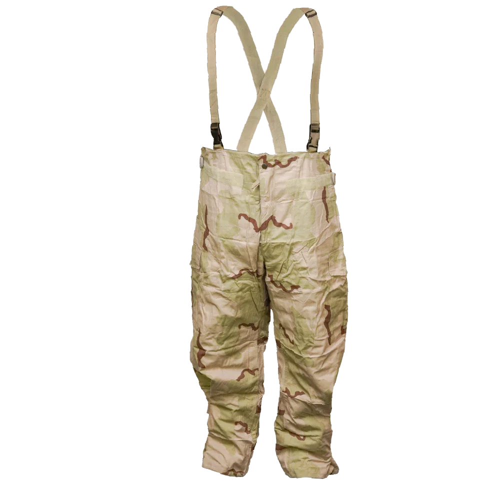 USGI 3 Colour Desert NBC Trousers in 3 Colour Desert camouflage. Constructed from a 50% nylon / 50% cotton outer shell with a protective liner. Designed as an overgarment with integrated adjustable suspenders, waist adjustment tabs, cargo pockets, and adjustable ankle closures.