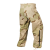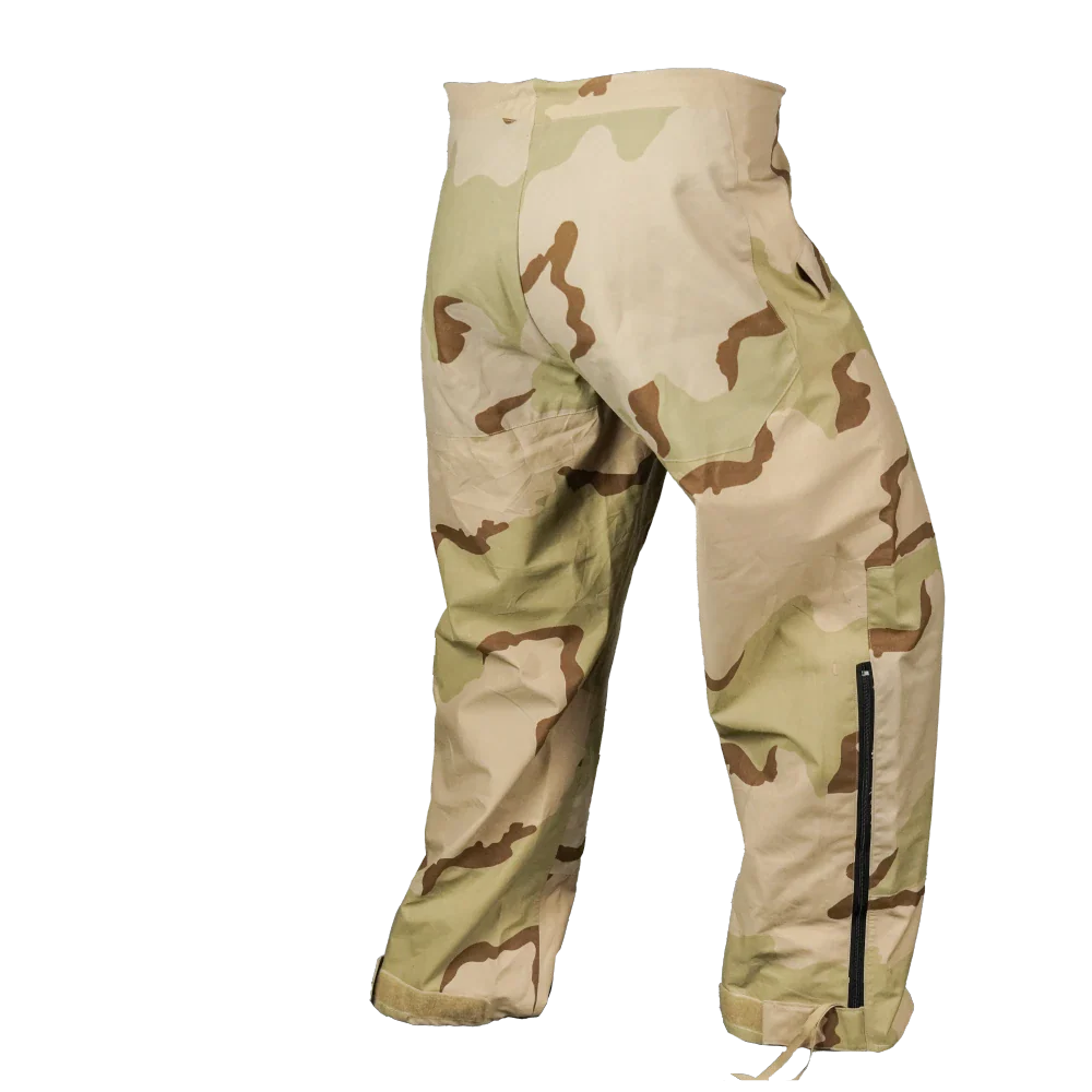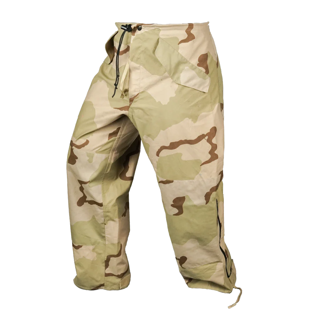U.S. Government Issue wet weather over-trousers in the 3-Colour Desert (DCU) camouflage pattern. Constructed as a lightweight shell layer intended to be worn over standard combat trousers. Features a waterproof outer shell with an adjustable waist drawcord and wide lower-leg openings to fit over boots.
