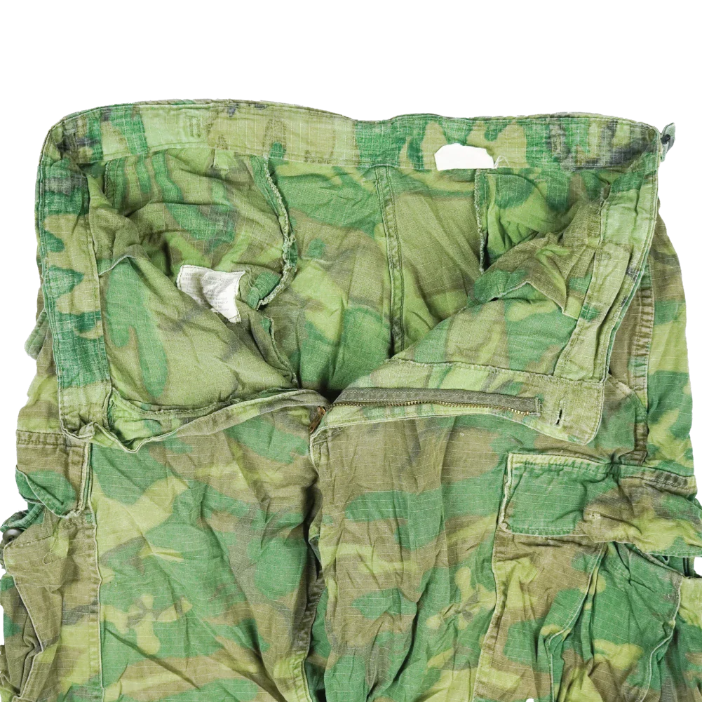 USGI ERDL 6th Pattern Jungle Fatigue Trousers made from ripstop poplin cotton fabric. Features two rear button secured pockets, two leg cargo pockets, adjustable waist straps, draw cords in the leg cuffs, and a zipper fly.