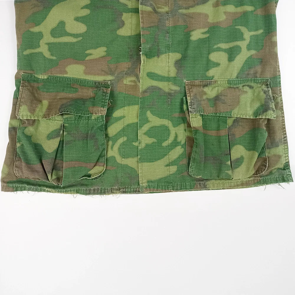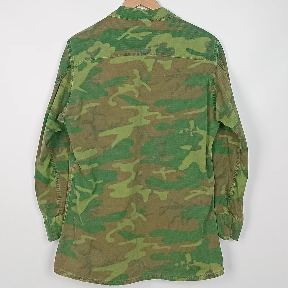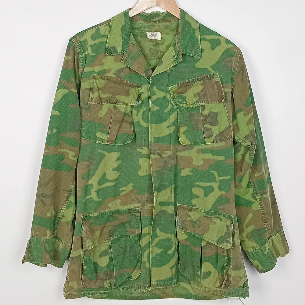 US issue slant pocket TCU ERDL jungle fatigue shirt. A nice example of green dominant ERDL with some damage but remains overall aesthetic and functional.