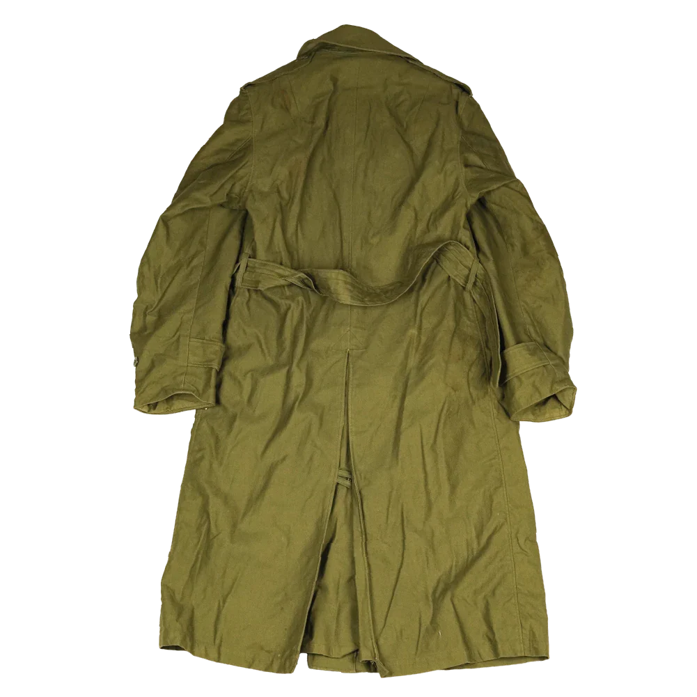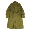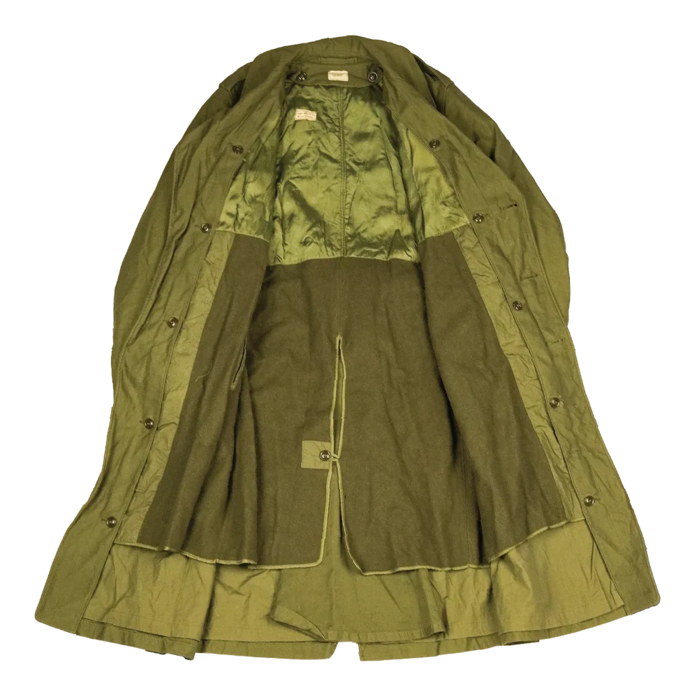 USGI M-1950 overcoat in a double-breasted design. It features waist pockets with flaps that open further into the coat, button-adjustable cuffs, and a buttoned liner attachment point.