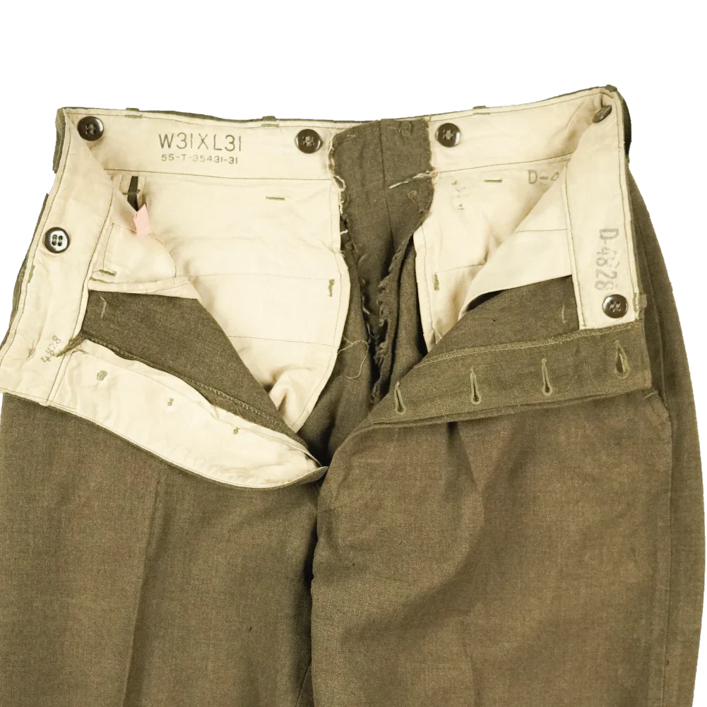 There are small holes on the right side of the crotch. Developed during the later part of WWII, these were an updated design of the US M-1937 trousers and saw service primarily during the Korean War.