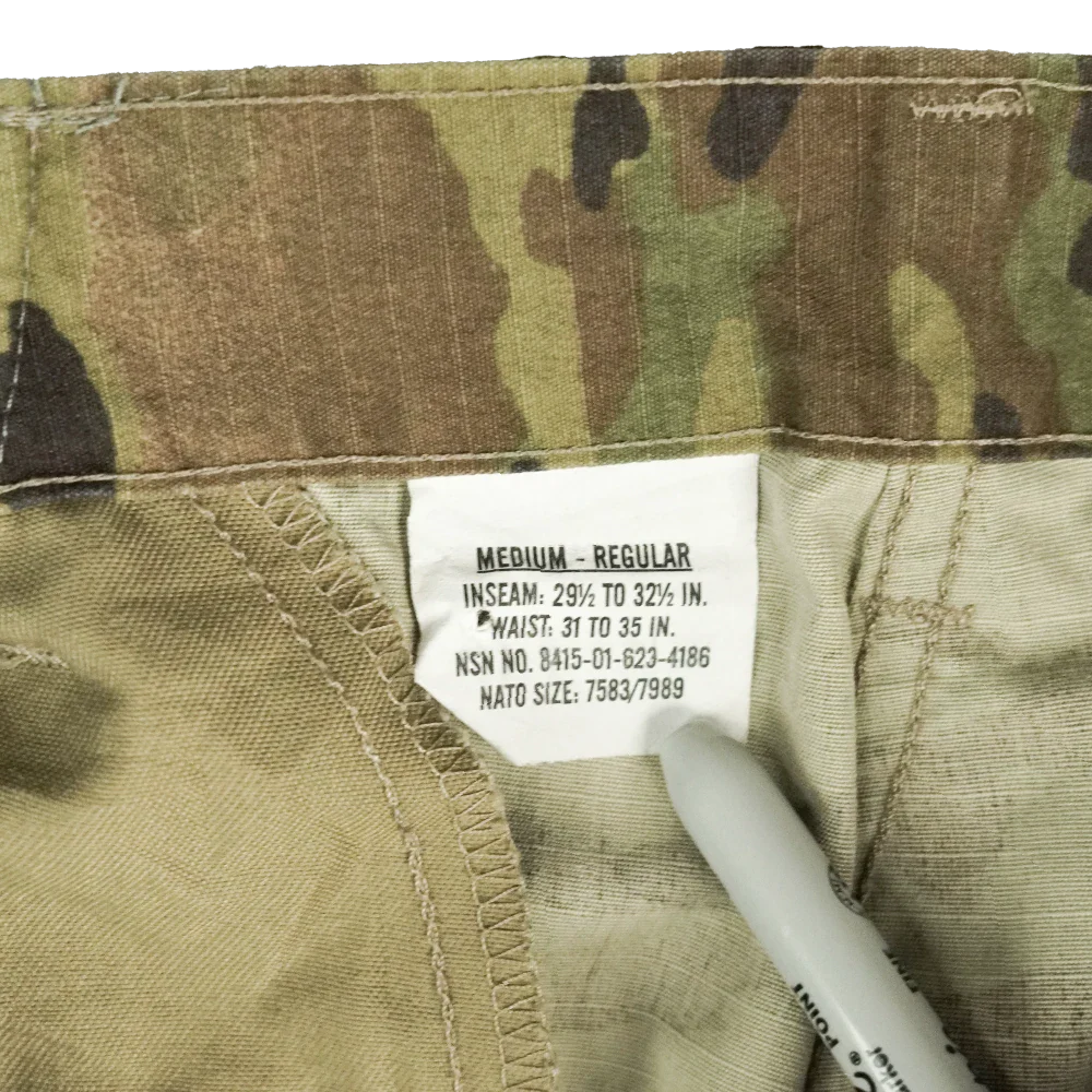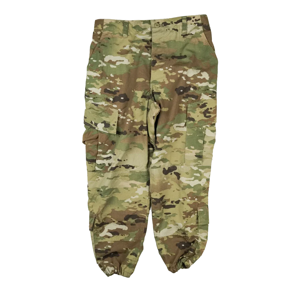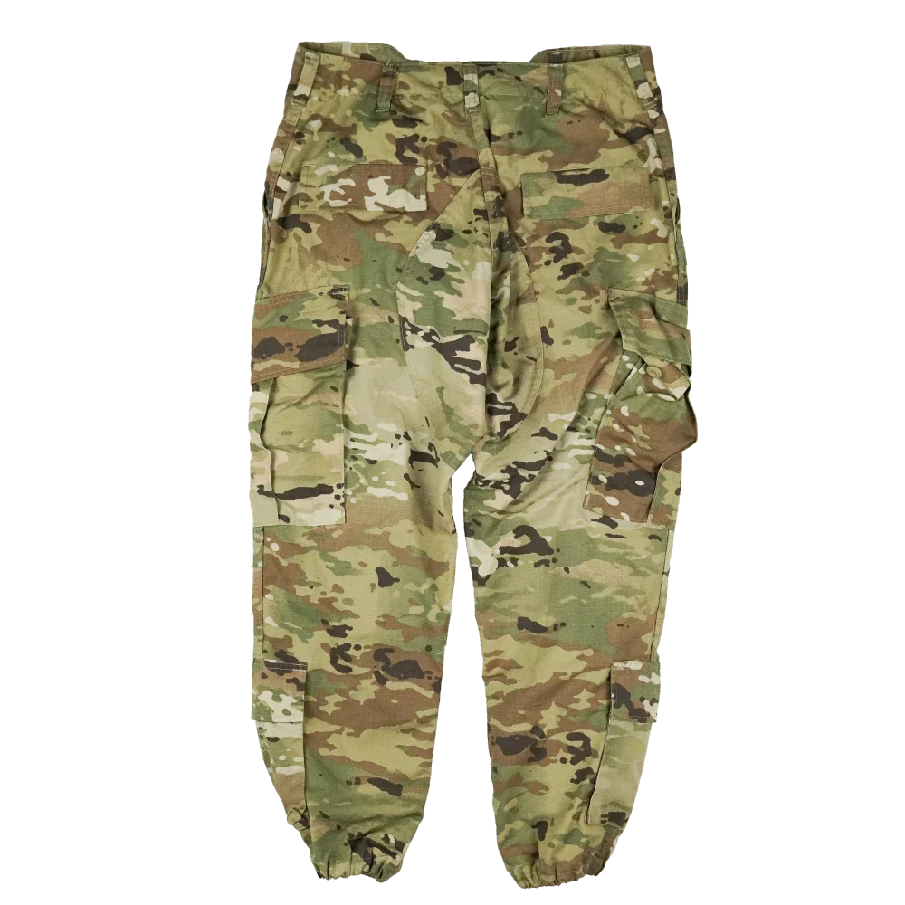 USGI issue OCP pattern trousers in a modified Medium-Regular size. The waist has been taken in to measure approximately 84 cm, and the original cuff ties have been replaced with trouser twists.