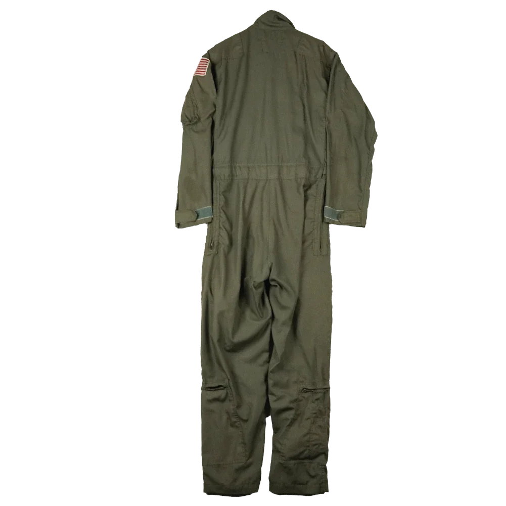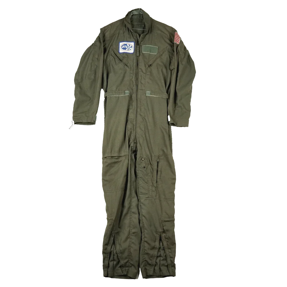 USGI pilot coveralls in a one-piece coverall construction. Features applied insignia including a USA flag patch on the left sleeve and an “Applied Technology Laboratory” logo on the chest.