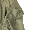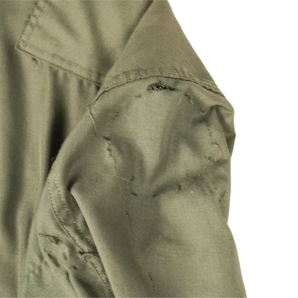 The collar lining is torn, and there is a tear at the location where a sleeve patch was removed.