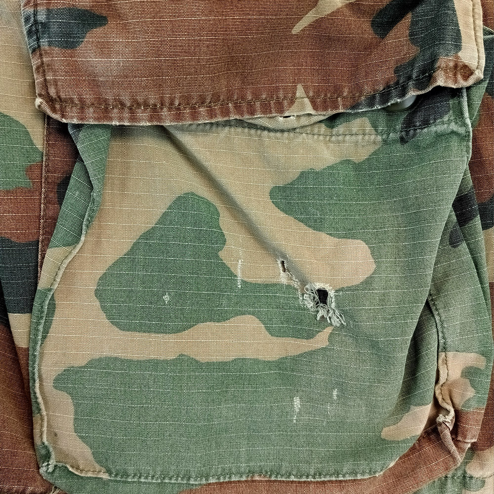 The shirt comes with four pockets in total, allowing the wearer to carry more gear like multi-tools, pocket torches, maps and fire starters. Two pockets sit on the chest with two larger pockets below them. The material is made in a nylon/cotton ripstop weave but needless to say, with enough use (let alone military) all things will eventually perish! With some TLC these could be bought back up to scratch for field use, used for spare parts or for those who like a bit of surplus with a 'vintage' wear to them, adopt one of these Genuine Woodland shirts!