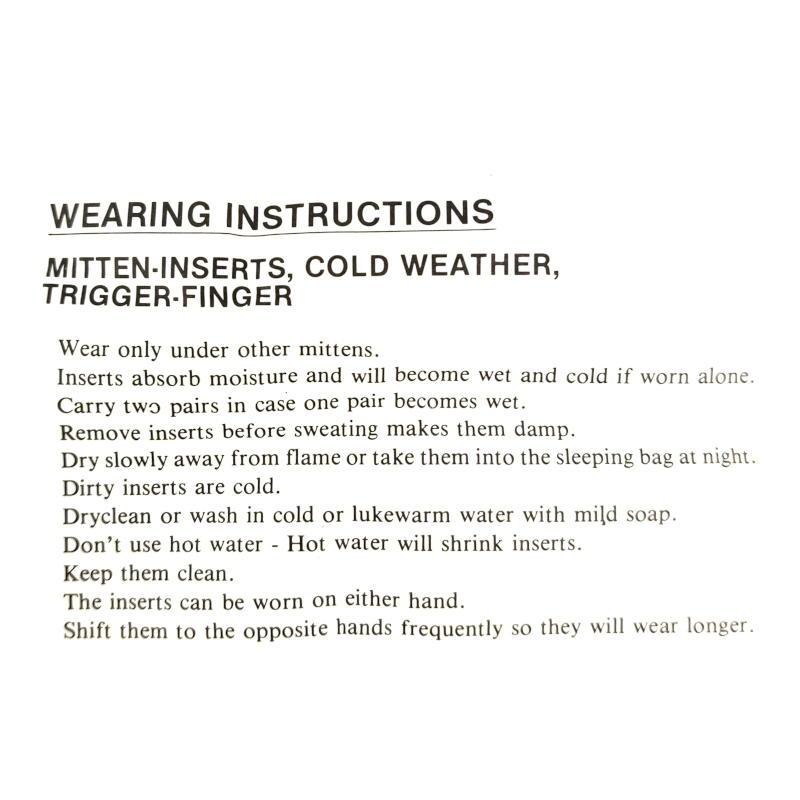 Insert your cold hands into a pair of woolen mitten inserts, fresh from the US Army. These are intended to slide into a pair of leather trigger finger mittens for operating in cold weather. By themselves, the inserts provide an insulating layer for use in mild conditions. The thumb and index finger are separated to offer more dexterity for pulling triggers and other precise finger motions. When such dexterity is not needed, you can scooch your index and thumb into the rest of the mitten to embrace the full warmth of your fellow fingers.