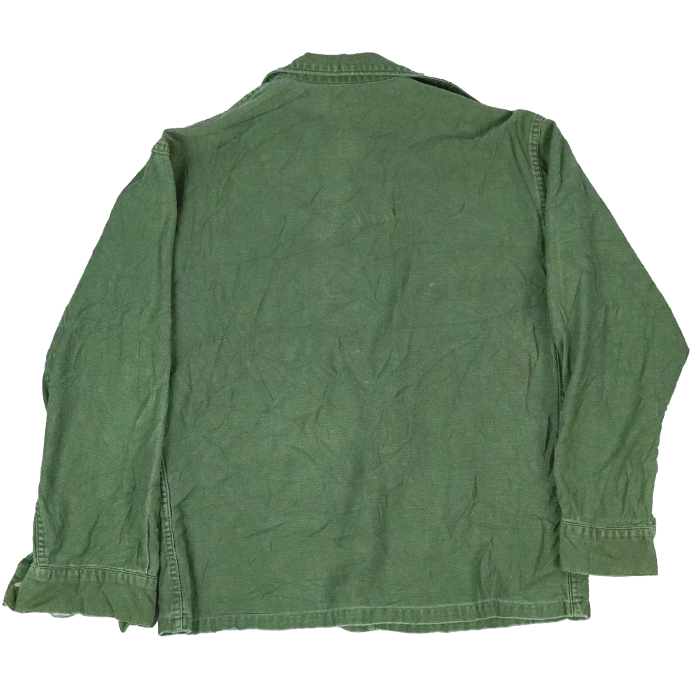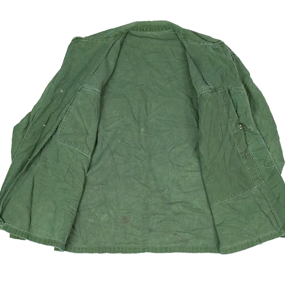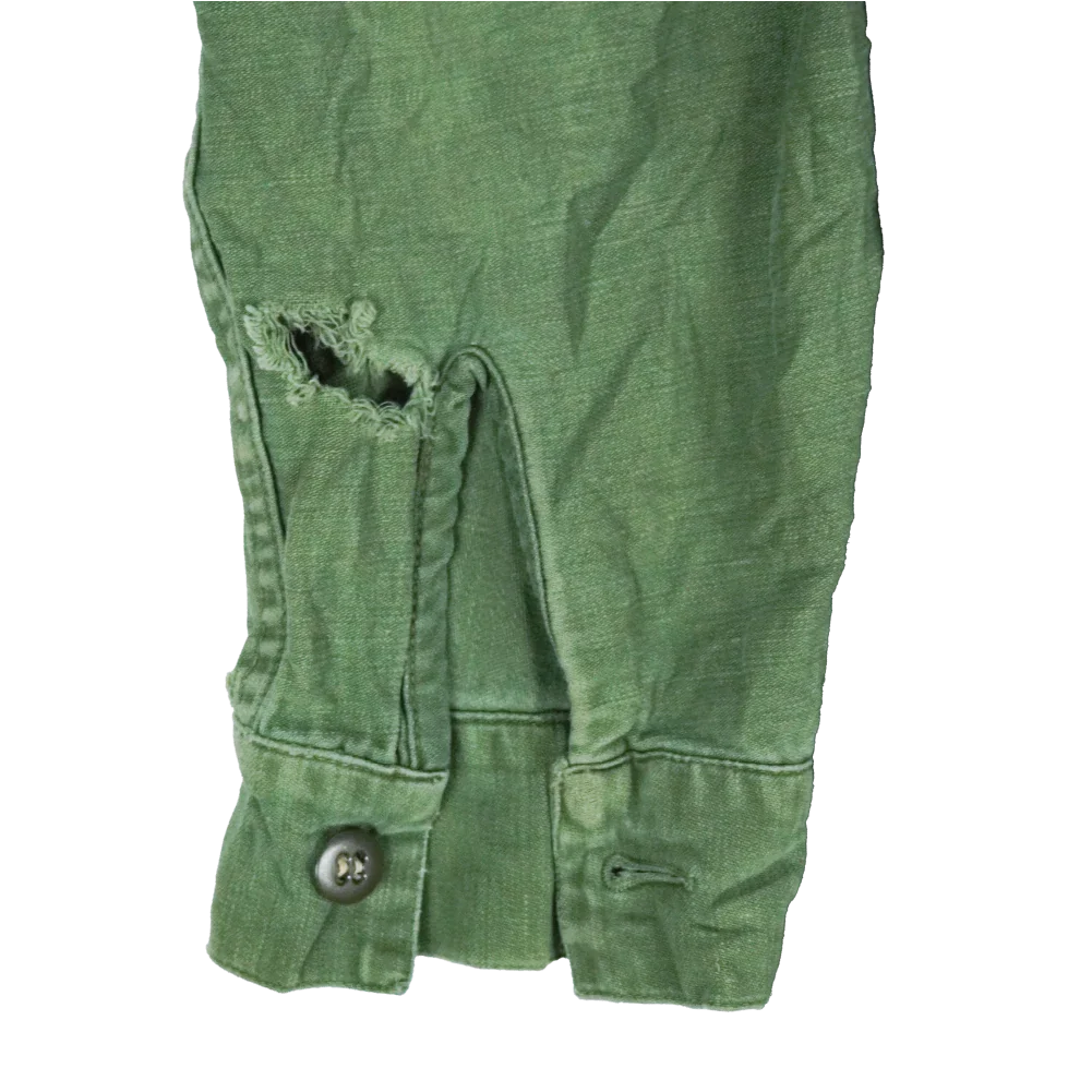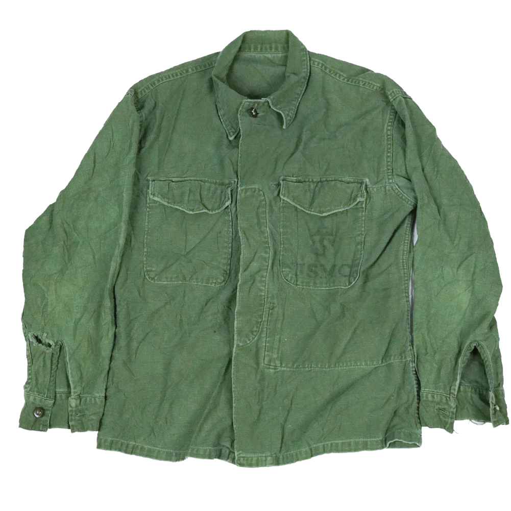 USMC P56 utility shirt in used, fair condition. Features two button-closure chest pockets and a large internal left chest pocket. The shirt is marked with a USMC and EGA (Eagle, Globe, and Anchor) pocket stamp.