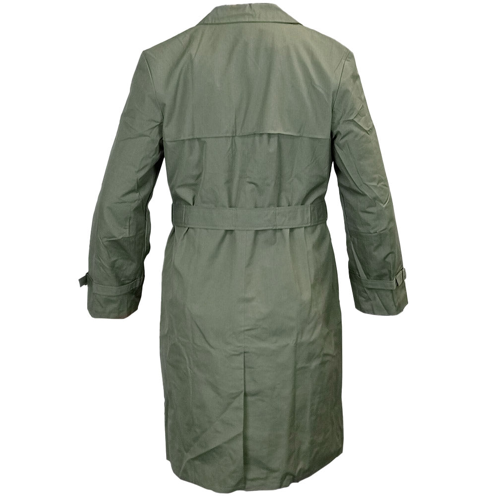 These have a water resistant outer and rubberised interior, additionally a layer around the upper inner torso assumed to act like a moisture vapour permeable layer. These come with belts (stashed in the pockets), adjustable belted cuffs and buttons on the underside of the collar to attach hoods which are unfortunately not included (though a few have a surprise hood stashed in a pocket too). Rank insignia can be attached via small loops and buttons to each shoulder. There is a little variation in hue to these coats but all are a degree of olive drab and in excellent quality, appearing to be unissued. The rubberised interior is in good condition but may be susceptible to abrasion wear, due to their age. The trench itself is very lightweight and packs down to a small size. Keep one handy to keep the rain off your rain camo, complete a kit or just generally stay dry in normal everyday situations.