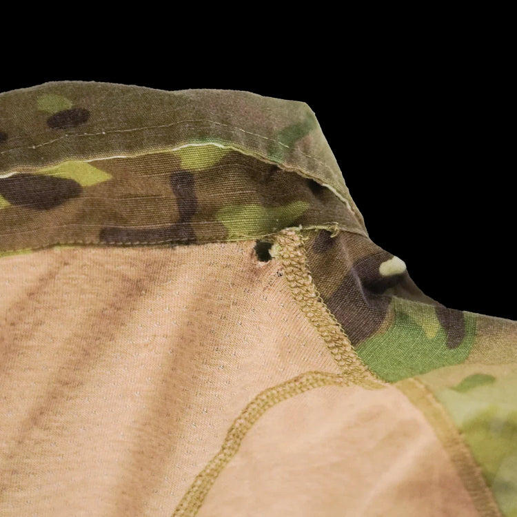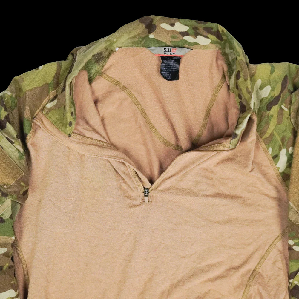 Commercial 5.11 Tactical Rapid Assault Shirt in Multicam. This is a pullover combat-style shirt with a mixed-fabric construction and integrated collar.